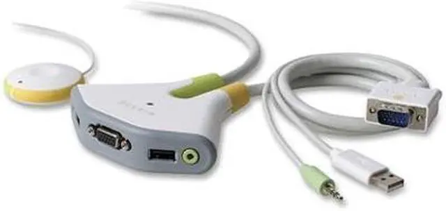 Flip two-port KVM (keyboard, video, mouse) switch is equipped with a remote and USB so you can share one monitor, keyboard and mouse between computers. Use KVM switch to shares one set of speakers between computers as well. Switch connects instantly to notebook computers and supports PC and Mac notebook and desktop computers. Two-color LED indicates which computer the switch is accessing. Design includes two built-in cables to connect computers and a remote base with cables. KVM switch installs in three easy steps with no software required.