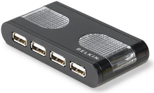 The Belkin F5U700-BLK Hi-Speed USB 2.0 7-Port Lighted Hub combines a sleek design with outstanding performance, through seven downstream USB ports. It lets you easily connect all your USB 1.1 and 2.0 devices to your computer, such as your MP3 player, digital camera, printer, and more. Its compact size and top-light design seamlessly fit and complement any desktop area.