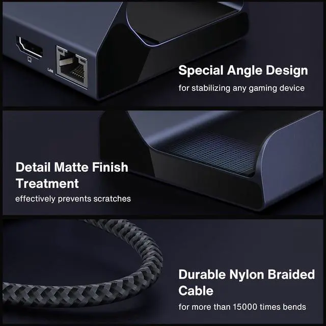 8-IN-1 Gaming Docking StationThis Steam Deck OLED Dock boasts an ultimate 6-in-1 connectivity. Featuring a 4K@144Hz HDMI port, a 1Gbps Ethernet port, three 5Gbps USB-A 3.0 ports, and a rapid-charging USB-C port,it delivers stable power to keep your devices battery charged during gameplay, this dock can perfectly complement your Type-c gaming console. The two equipped joystick caps can protect your joysticks from external friction and scratches.Dock Deck to your TV and play games on the couch with your favorite wireless controllers.