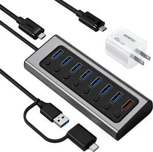 BENFEI 7-Port USB 3.0 Data Hub with BC 1.2 Charging Port, 45W GaN Super Fast Charger Dual Type C