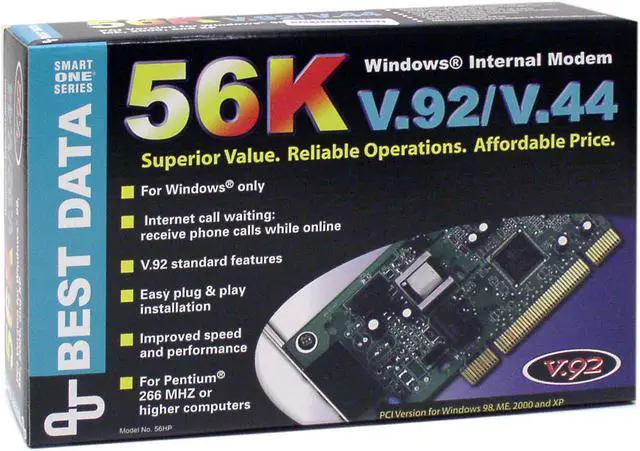 | Features | System Requirements: A Pentium 266 MHz or higher PC computer A CD-ROM Drive A hard disk with 20MB available 32MB RAM Microsoft Windows 98, ME, 2000, and XP A standard analog telephone line Internet Service Provider (ISP) needs to support V.92 for advanced features Must have call waiting (for Internet on Hold feature) Connect Faster: Quickconnect reduces the start-up time required to establish a connection. Cut your connect time by up to 40% or more Download Faster: New V.44 compression delivers up to 40% more through-put for HTML documents & pages Internet Call-Waiting: V.92 standard features Modem-on-Hold, allowing you to receive a incoming call and stay connected to the Internet (Call-Waiting service from your phone company is required) For Windows Only Easy PCI Installation Improved Speed and Performance For Pentium 266 MHz or Higher PC Computers With the V.92 56K modem - you get it all! Faster web browsing. Faster connect speeds. Take phone calls while online Send documents at high speeds to fax machines or fax-modems Send Video Email Play games via the Internet Quick and Easy to install and use Fax Features (With the included fax software) Fax Broadcasting: Send out faxes to multiple locations Fax Scheduling: Take advantage of low phone rates Fax Merging: Combine documents from a different application into one fax Multiple fax phone list |