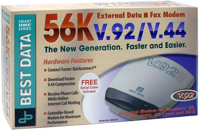 | Features | System Requirements: An IBM 486, Pentium or Higher A CD-ROM Drive A hard disk with 20MB available 32 MB RAM Microsoft Windows 98, ME, 2000,Linux,DOS and XP A standard analog telephone line Internet Service Provider (ISP) needs to support V.92 for advanced features Must have call waiting (for Internet on Hold feature) Connect Faster: Quickconnect reduces the start-up time required to establish a connection. Cut your connect time by up to 40% or more Download Faster: New V.44 compression delivers up to 40% more through-put for HTML documents & pages Internet Call-Waiting: V.92 standard features Modem-on-Hold, allowing you to receive a incoming call and stay connected to the Internet (Call-Waiting service from your phone company is required) Controller-based Modem delivers the reliability of a hardware-based connection without using your PC's processor |
