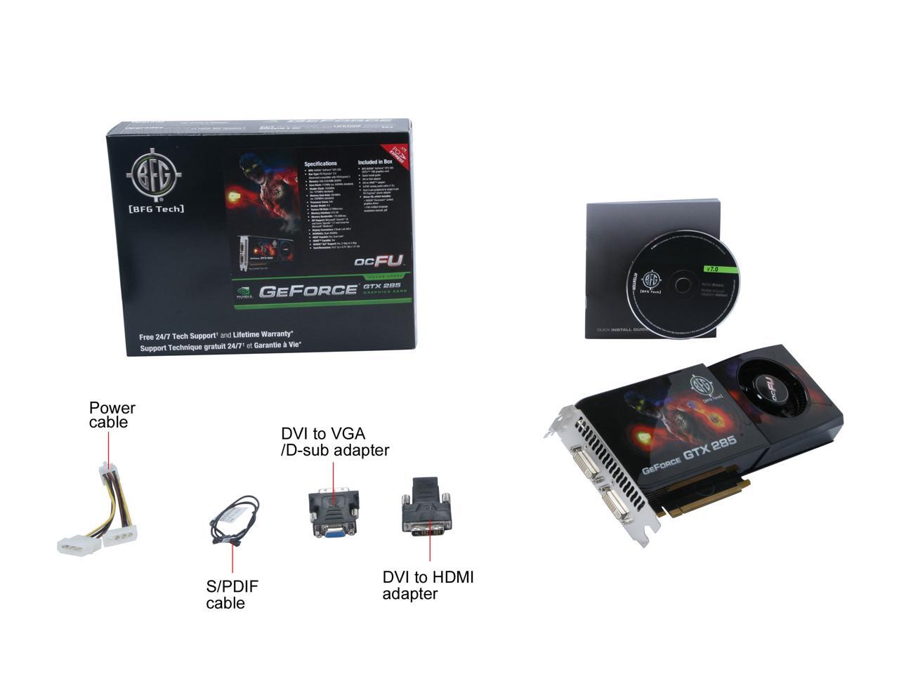| Package Contents | BFGEGTX2851024OCFUBE Quick install guide DVI to VGA adapter DVI to HDMI adapter S/PDIF analog audio cable (1 ft.) Dual 4-pin peripheral to single 6-pin PCI Express power adapter Driver CD |