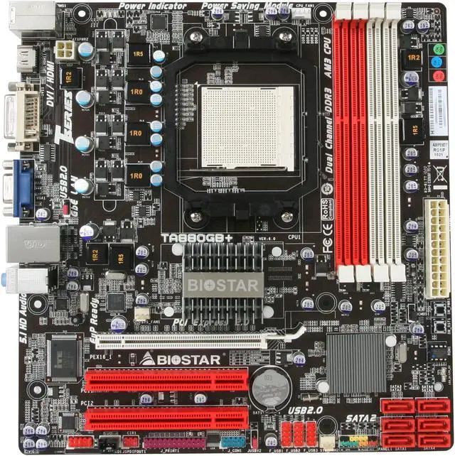 Get more for your money with the TA880GB+ motherboard by Biostar. This Micro ATX board supports AMD's Socket AM3 CPU including the Phenom II, Athlon II and other AM3 CPUs. Install up to 16GB of DDR3 memory with dual channel support to power through complex operations. Hyper Transport 3.0 technology massively increases the CPU bandwidth at lower power levels for cooler operation.