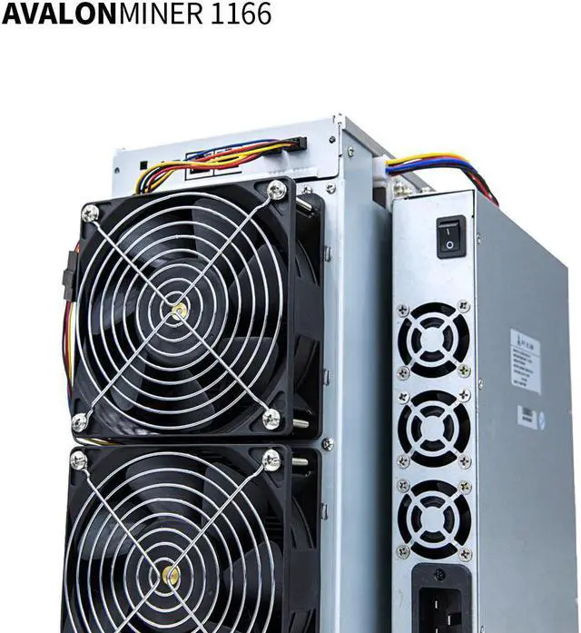 Model Avalon Miner 1166 Pro from Canaan mining SHA-256 algorithm with a maximum hashrate of 75Th/s for a power consumption of 3420W.