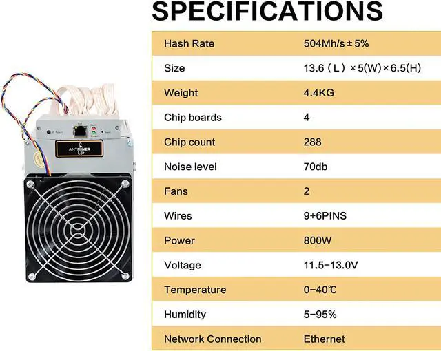 1. Model Antminer L3++ (580Mh) from Bitmain mining Scrypt algorithm with a maximum hashrate of 580Mh/s for a power consumption of 1000W. 2. Compatible Coins - Any coin based on the Scrypt algorithm. There are many dozen coins, but the most well known is Litecoin and Dogecoin. 3.