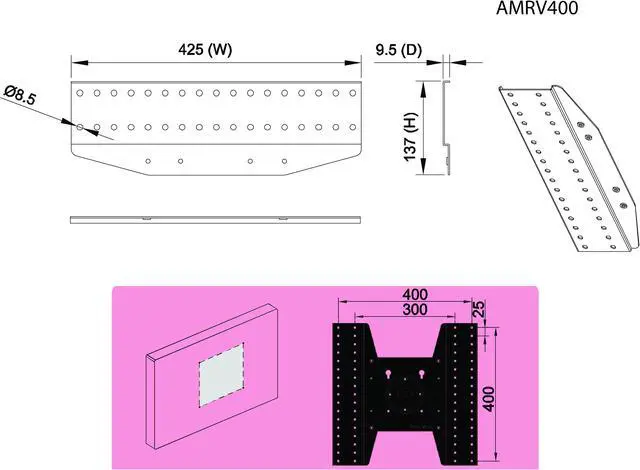 Amer Monitor / LCD extension kit allows the extension of an existing monitor mount to extend 100x200mm or 200x200 Mounting patterns to support a device requiring 400x400mm patterns