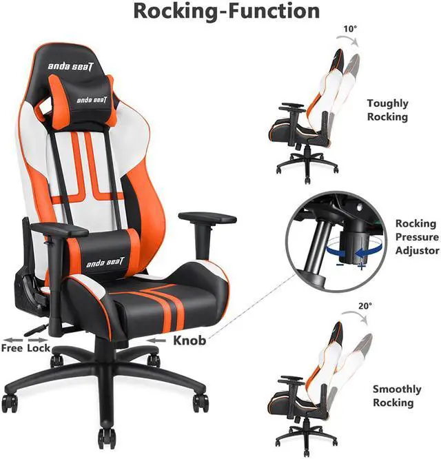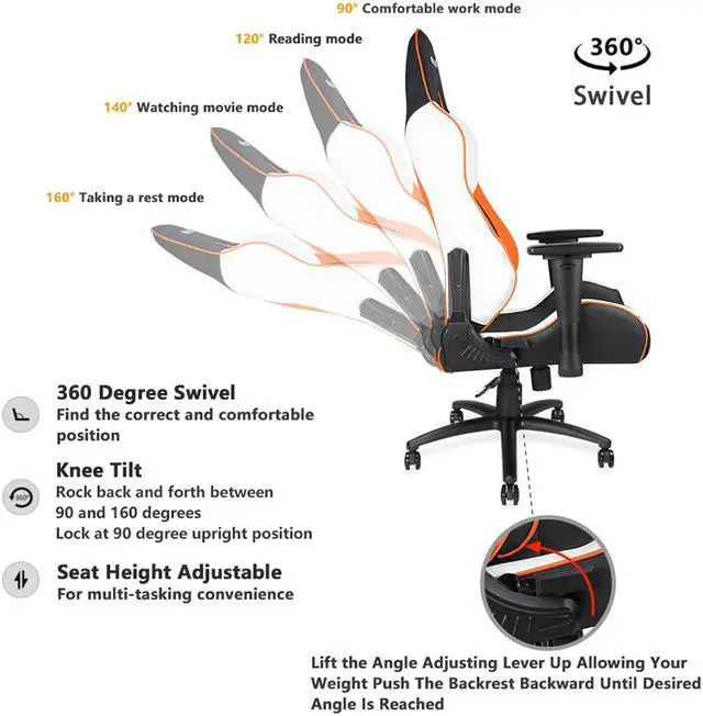 MULTIFUNCTION:360 Degree Swivel Rocker Tilt E-Sports Chair, Full recline function with 90 to 160 degree backwards movement, can be lying down like bed and can be locked at any angle,adjustable armrest and seat height adjustment,removable headrest pillow and lumbar cushion,Multi-direction high quality Wheel Move Smoothly On Floor without making any noise, all to make it an ideal seat.