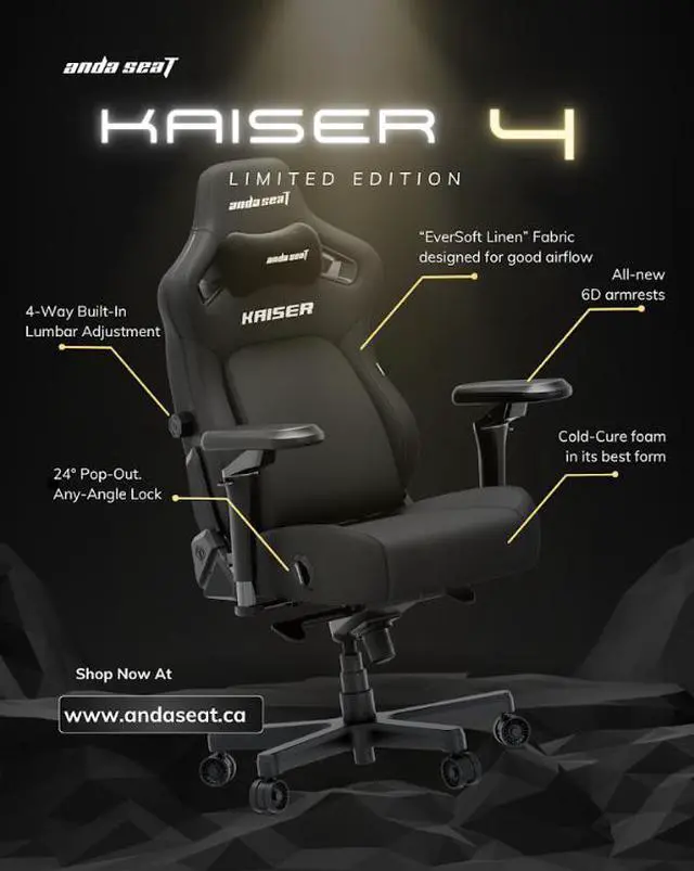 The AndaSeat Kaiser 4 takes ergonomic seating to the next level, delivering a perfect balance of comfort and innovation. Designed with an all-new advanced lumbar support system, it ensures optimal posture and personalized back support for long hours of gaming or office work. Enhanced comfort is achieved with its refined cushioning and breathable materials, while the reimagined armrest system offers exceptional adjustability and stability, giving users complete freedom to customize their seating experience. The Kaiser 4 is more than just a chair; it is a forward-thinking solution built for comfort and performance.