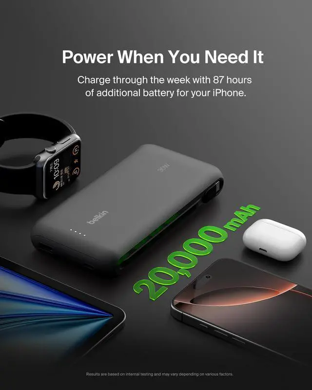 • 30W OUTPUT LETS YOU FAST CHARGE SMARTPHONES & TABLETS: This Belkin portable charger has a powerful 30W output, allowing you to fast charge your smartphones and tablets. This output even allows you to charge a MacBook Air up to 30W.
