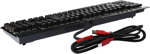 | Features | 100% Cherry MX Red Key Switches Onboard memory to take performance and lighting settings with you Easy-access dedicated multimedia controls Aircraft-grade black anodized brushed aluminum finish 100% anti-ghosting with 122 key rollover on USB Detachable soft-touch wrist rest |