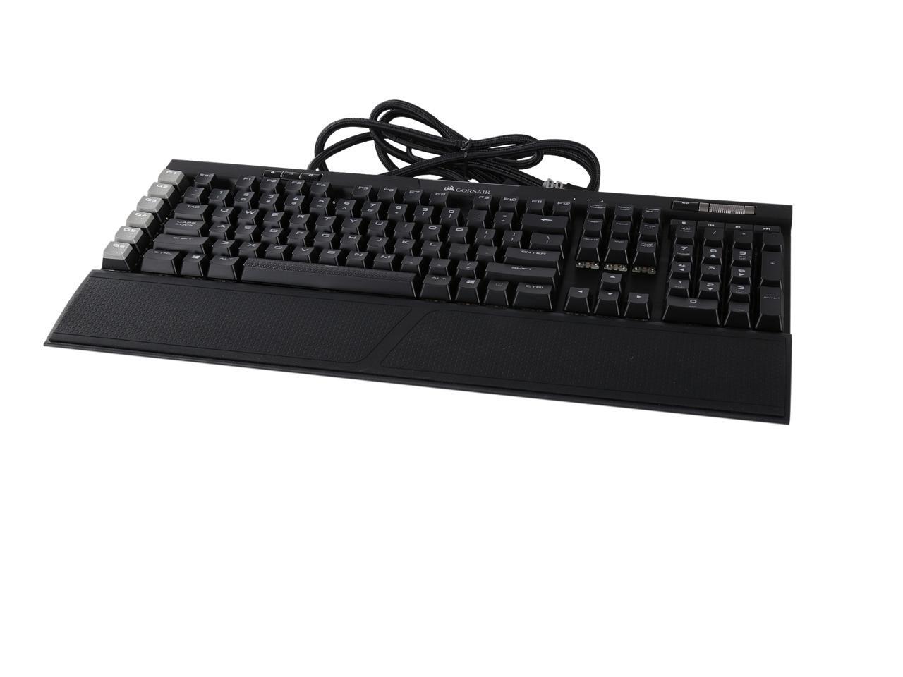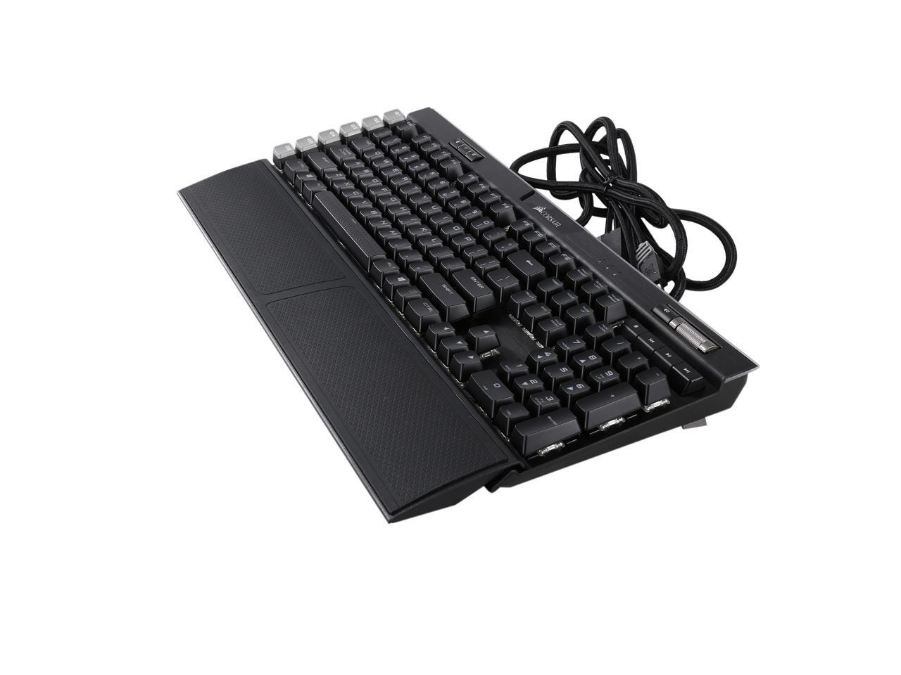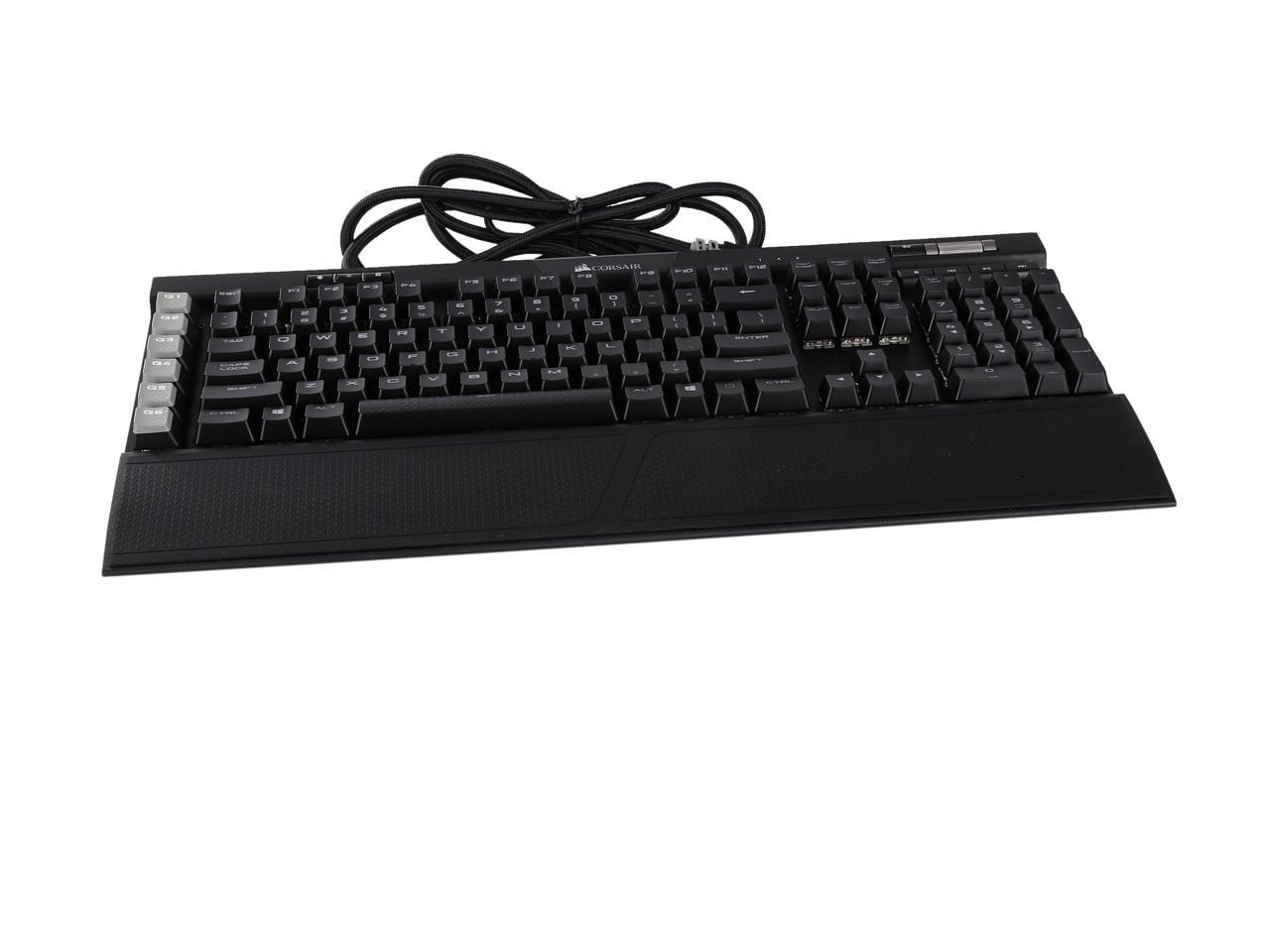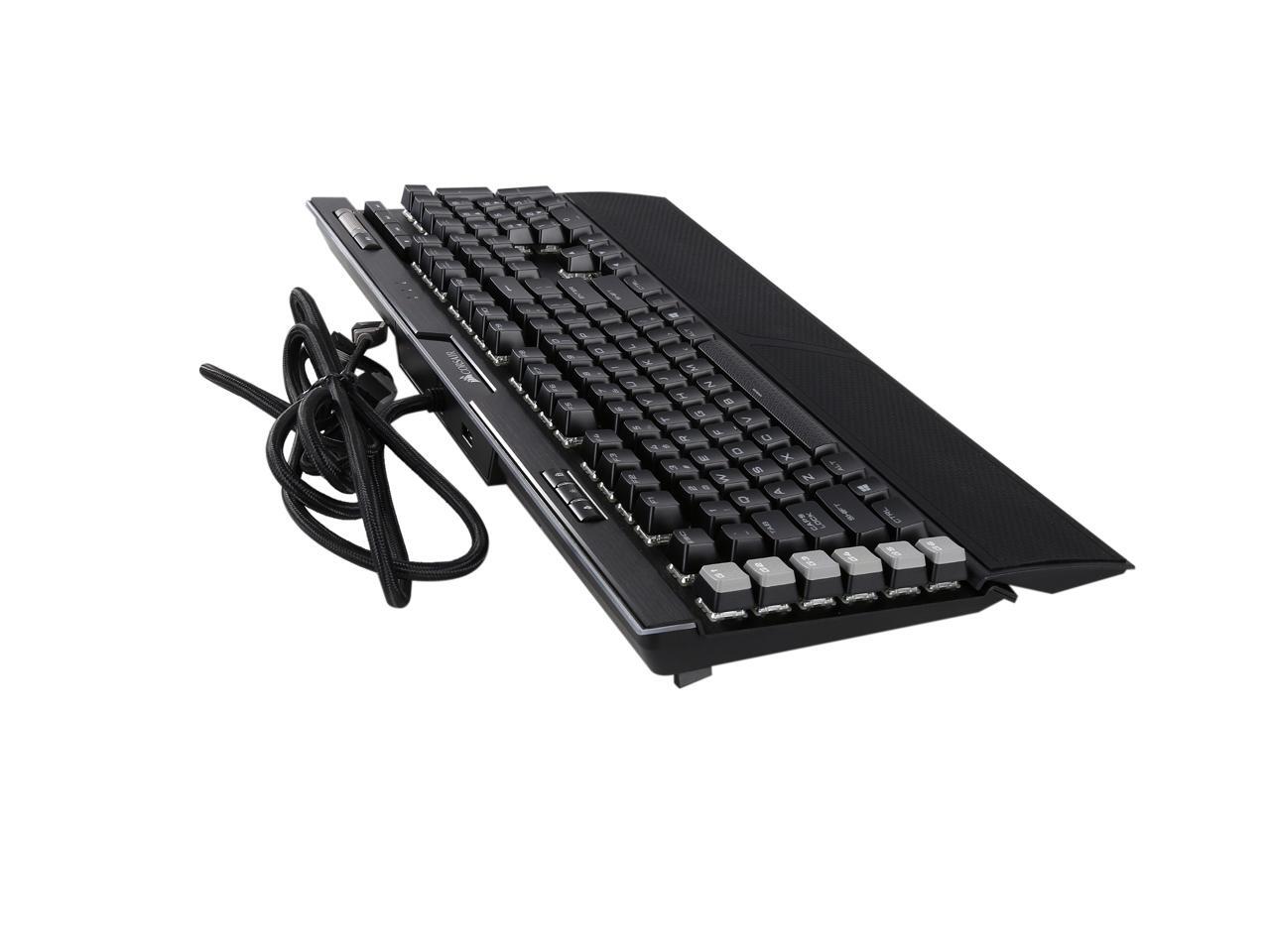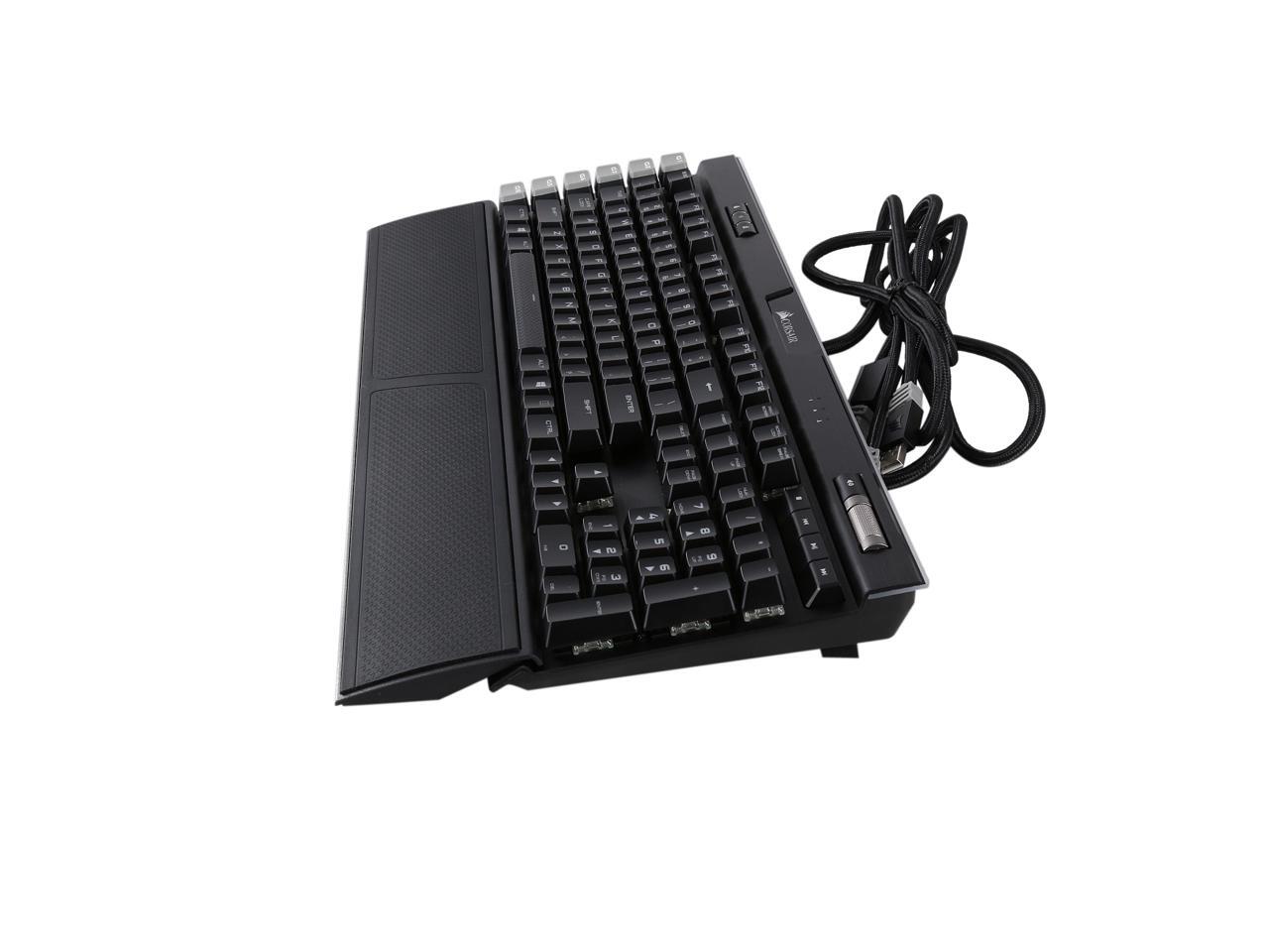 | Features | Aircraft-grade anodized brushed aluminum frame: Built to withstand a lifetime of gaming. Lightweight and rugged durability, necessary for a keyboard that’s going to see a lot of action. 8MB profile storage with hardware macro and lighting playback: Allow access up to three stored profiles on the go, independent of external software. Dynamic multicolor per key backlighting with LightEdge: Adjust each key's color and illumination level in addition to 19-zones on the top edge light bar for sophisticated and dramatic animations and effects. 100% CHERRY MX Speed RGB mechanical key switches: Unleash blistering speed with the 1.2 mm actuation and durability of gold contact CHERRY MX mechanical key switches. 6 programmable G-keys keys for in-game macros: Assign single keystrokes or complex multi-key combos to any of the 6 dedicated macro keys. USB Pass-Through Port: Provides convenient access to an additional USB port for your mouse or headset. Detachable, dual-sided soft-touch wrist rest: The comfort to enhance your gameplay during marathon gaming sessions. Choose between two different surfaces for optimal comfort. Dedicated volume and multimedia controls: Control to adjust audio on-the-fly, without interrupting your game. 100% anti-ghosting with full key rollover: No matter how fast your in-game actions are, every keypress registers correctly. Fully programmable with CUE: Intuitive and powerful Corsair Utility Engine (CUE) enables sophisticated macro programming and fast, fluid dynamic multicolor illumination. Windows Key lock mode: Stay focused and prevent accidental Windows and Context Menu key presses. FPS and MOBA keycap sets: Textured and contoured keycaps provide maximum grip and enhanced feel. |