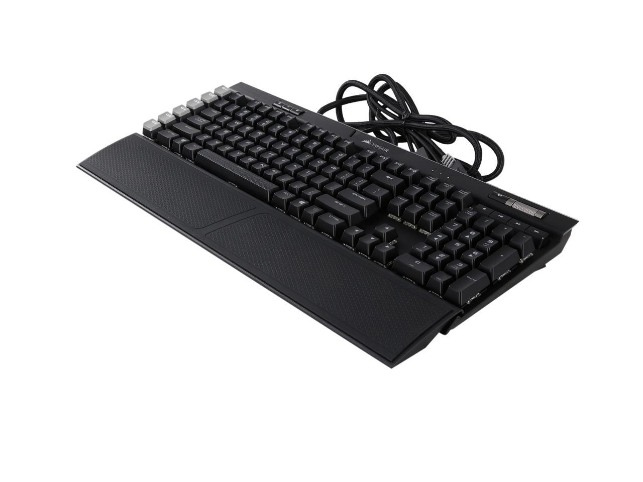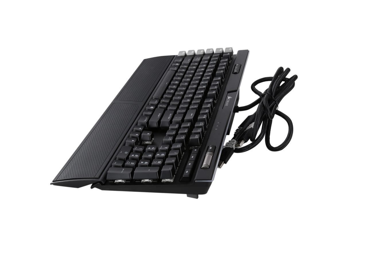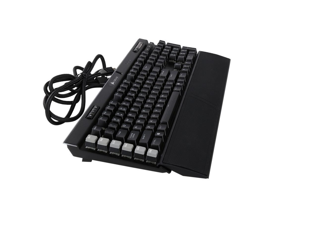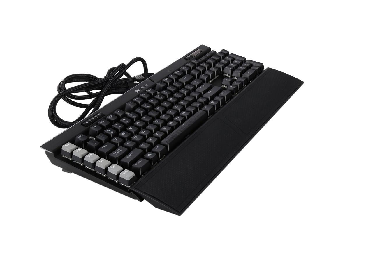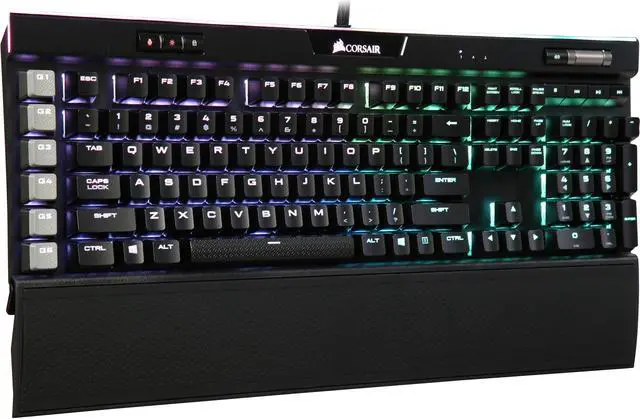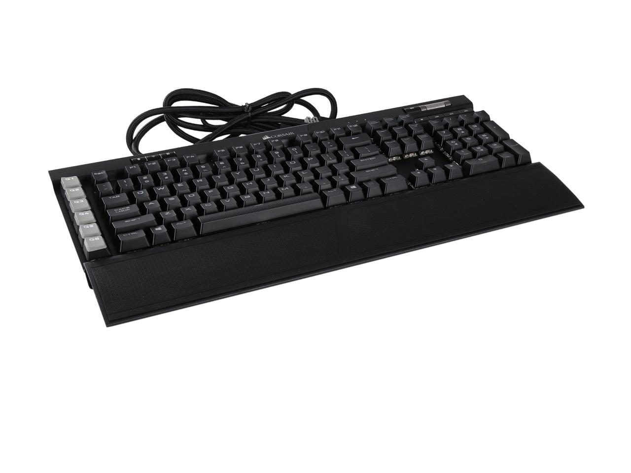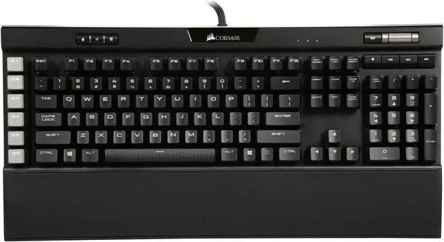 | Features | Aircraft-grade anodized brushed aluminum frame: Built to withstand a lifetime of gaming. Lightweight and rugged durability, necessary for a keyboard that’s going to see a lot of action. 8MB profile storage with hardware macro and lighting playback: Allow access up to three stored profiles on the go, independent of external software. Dynamic multicolor per key backlighting with LightEdge: Adjust each key's color and illumination level in addition to 19-zones on the top edge light bar for sophisticated and dramatic animations and effects. 100% CHERRY MX Speed RGB mechanical key switches: Unleash blistering speed with the 1.2 mm actuation and durability of gold contact CHERRY MX mechanical key switches. 6 programmable G-keys keys for in-game macros: Assign single keystrokes or complex multi-key combos to any of the 6 dedicated macro keys. USB Pass-Through Port: Provides convenient access to an additional USB port for your mouse or headset. Detachable, dual-sided soft-touch wrist rest: The comfort to enhance your gameplay during marathon gaming sessions. Choose between two different surfaces for optimal comfort. Dedicated volume and multimedia controls: Control to adjust audio on-the-fly, without interrupting your game. 100% anti-ghosting with full key rollover: No matter how fast your in-game actions are, every keypress registers correctly. Fully programmable with CUE: Intuitive and powerful Corsair Utility Engine (CUE) enables sophisticated macro programming and fast, fluid dynamic multicolor illumination. Windows Key lock mode: Stay focused and prevent accidental Windows and Context Menu key presses. FPS and MOBA keycap sets: Textured and contoured keycaps provide maximum grip and enhanced feel. |
