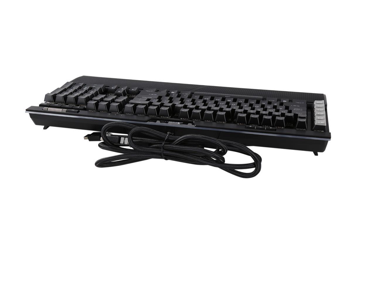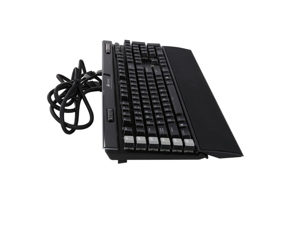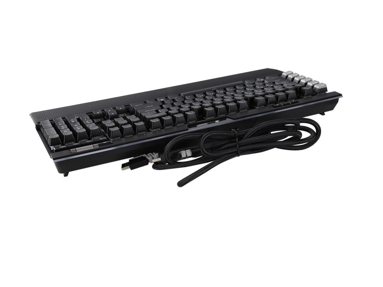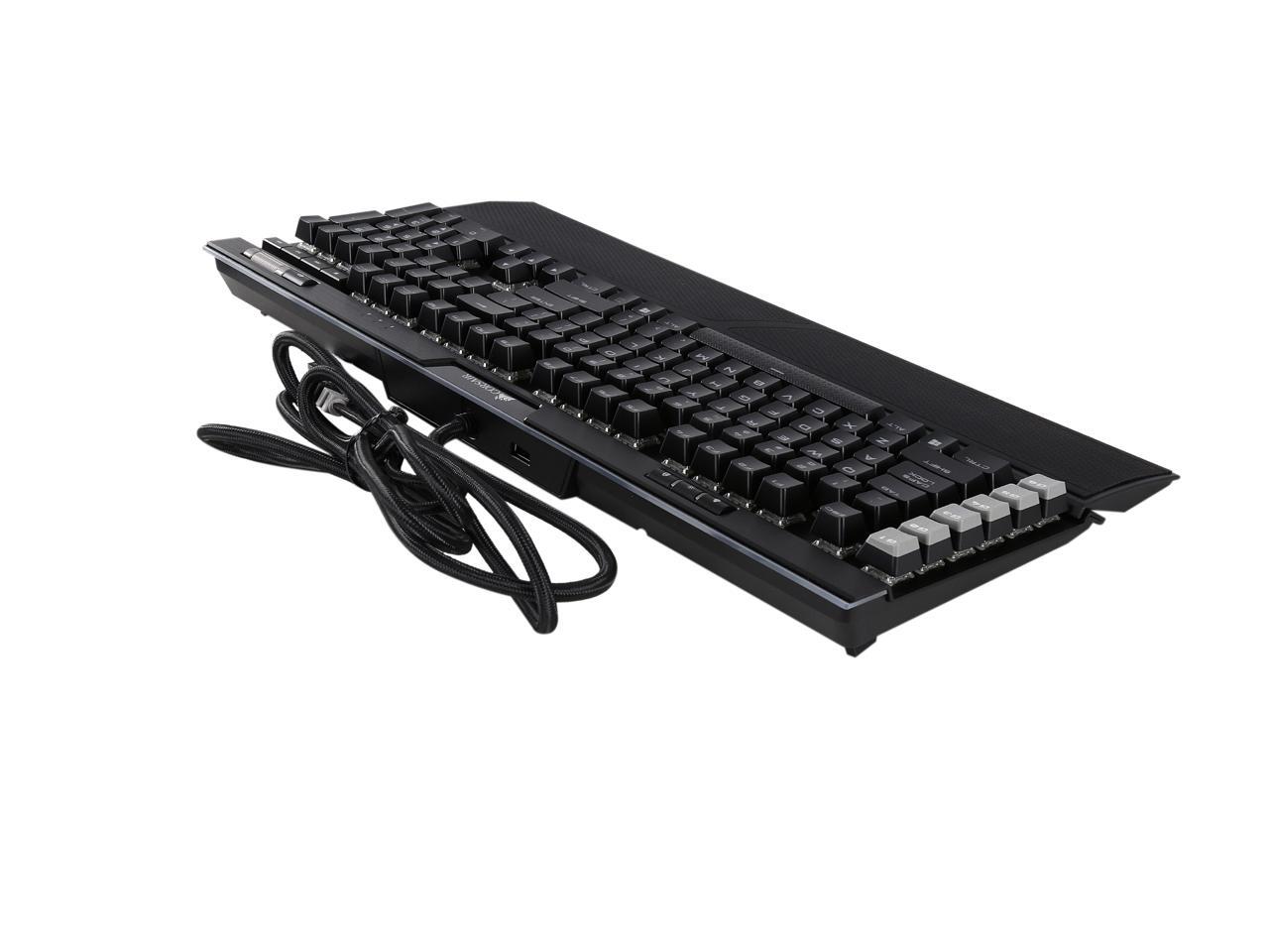 | Features | Aircraft-grade anodized brushed aluminum frame: Built to withstand a lifetime of gaming. Lightweight and rugged durability, necessary for a keyboard that’s going to see a lot of action. 8MB profile storage with hardware macro and lighting playback: Allow access up to three stored profiles on the go, independent of external software. Dynamic multicolor per key backlighting with LightEdge: Adjust each key's color and illumination level in addition to 19-zones on the top edge light bar for sophisticated and dramatic animations and effects. 100% CHERRY MX Speed RGB mechanical key switches: Unleash blistering speed with the 1.2 mm actuation and durability of gold contact CHERRY MX mechanical key switches. 6 programmable G-keys keys for in-game macros: Assign single keystrokes or complex multi-key combos to any of the 6 dedicated macro keys. USB Pass-Through Port: Provides convenient access to an additional USB port for your mouse or headset. Detachable, dual-sided soft-touch wrist rest: The comfort to enhance your gameplay during marathon gaming sessions. Choose between two different surfaces for optimal comfort. Dedicated volume and multimedia controls: Control to adjust audio on-the-fly, without interrupting your game. 100% anti-ghosting with full key rollover: No matter how fast your in-game actions are, every keypress registers correctly. Fully programmable with CUE: Intuitive and powerful Corsair Utility Engine (CUE) enables sophisticated macro programming and fast, fluid dynamic multicolor illumination. Windows Key lock mode: Stay focused and prevent accidental Windows and Context Menu key presses. FPS and MOBA keycap sets: Textured and contoured keycaps provide maximum grip and enhanced feel. |
