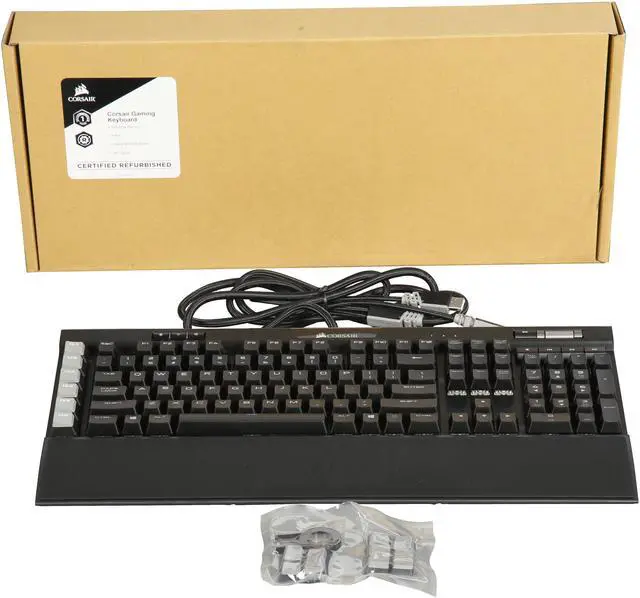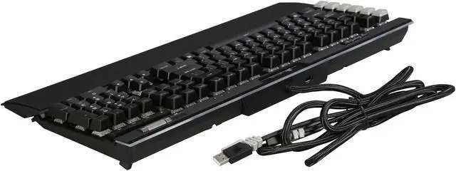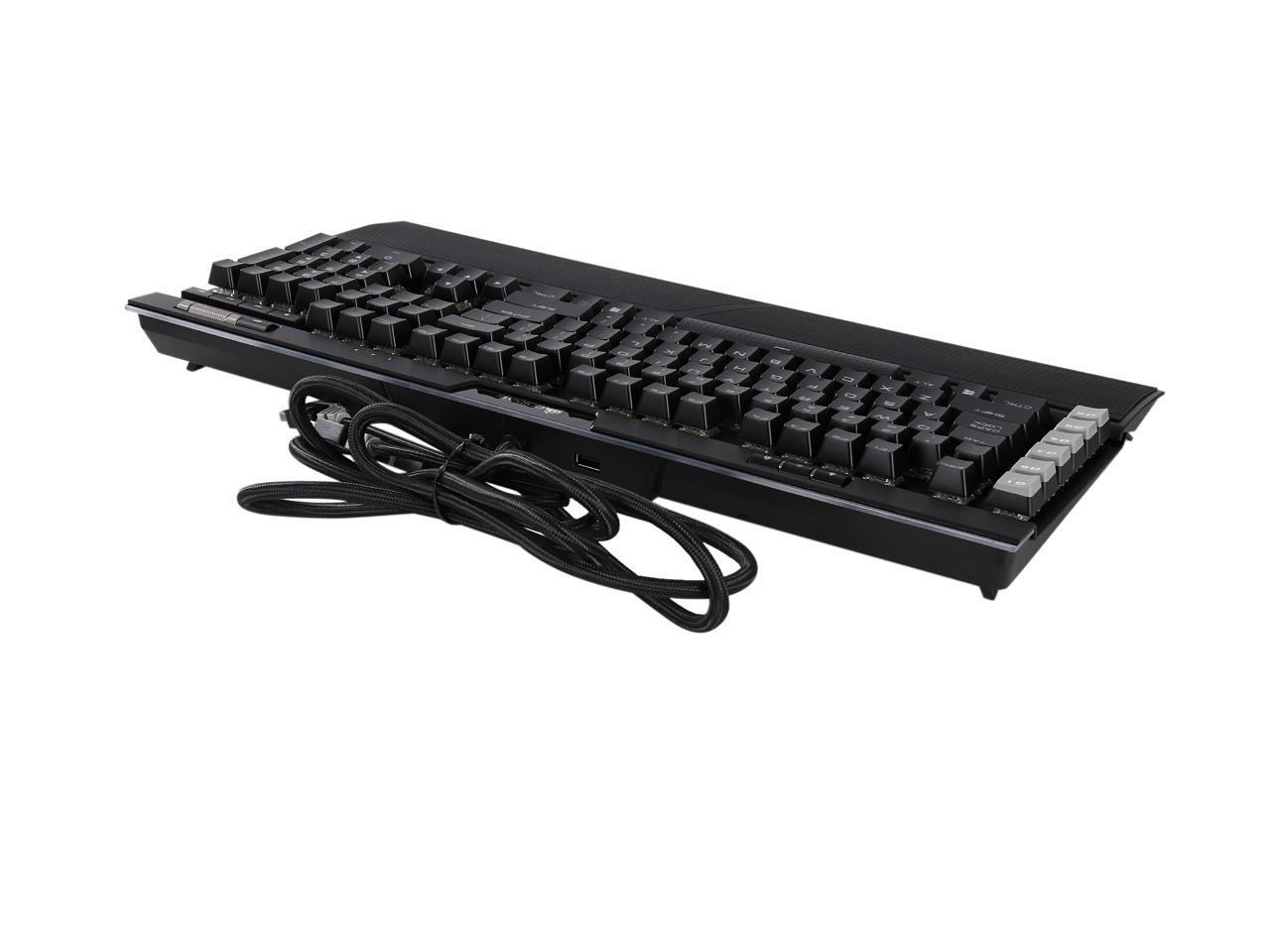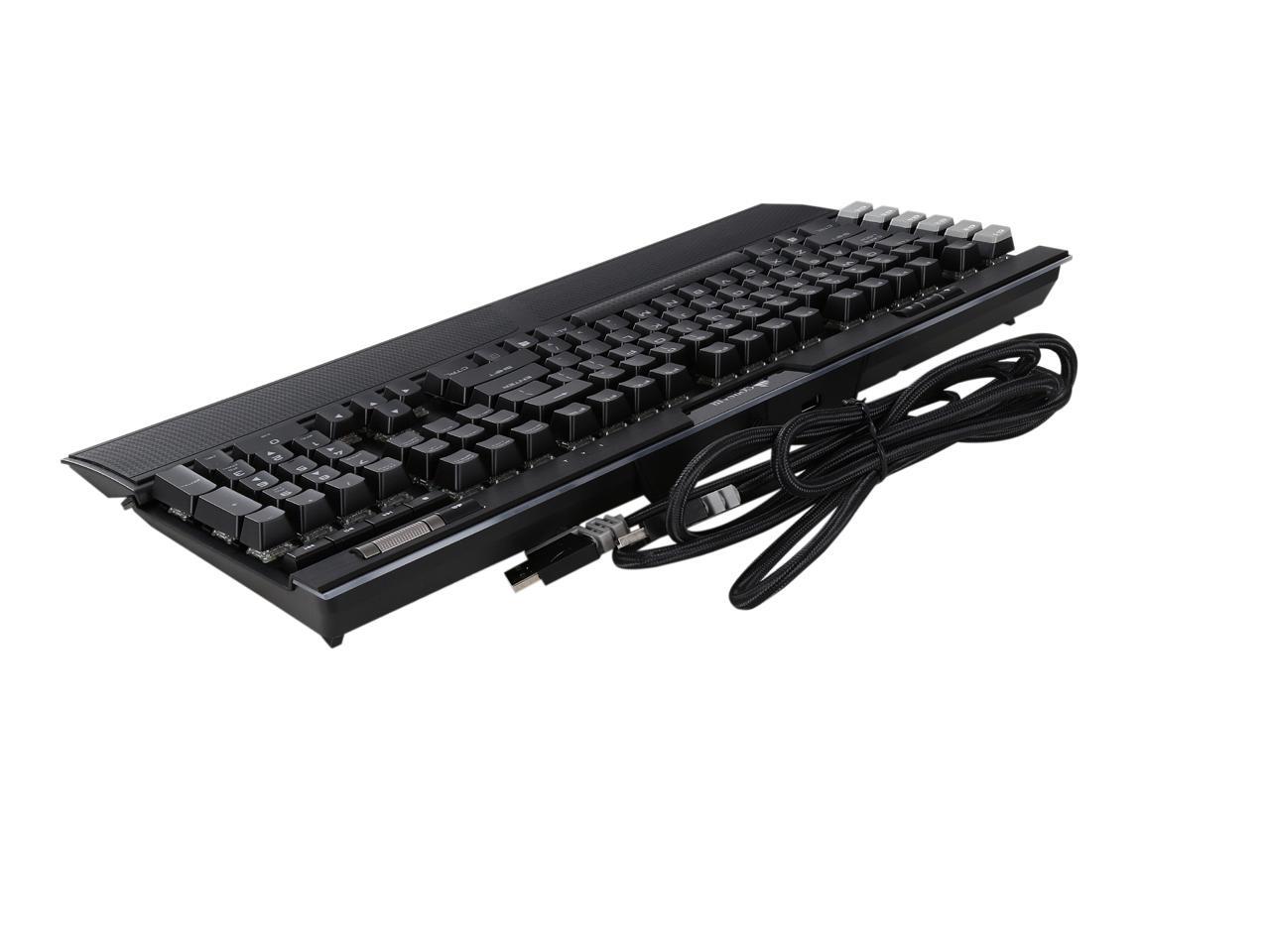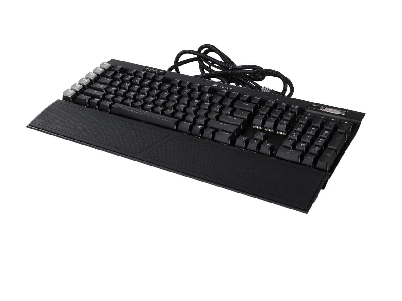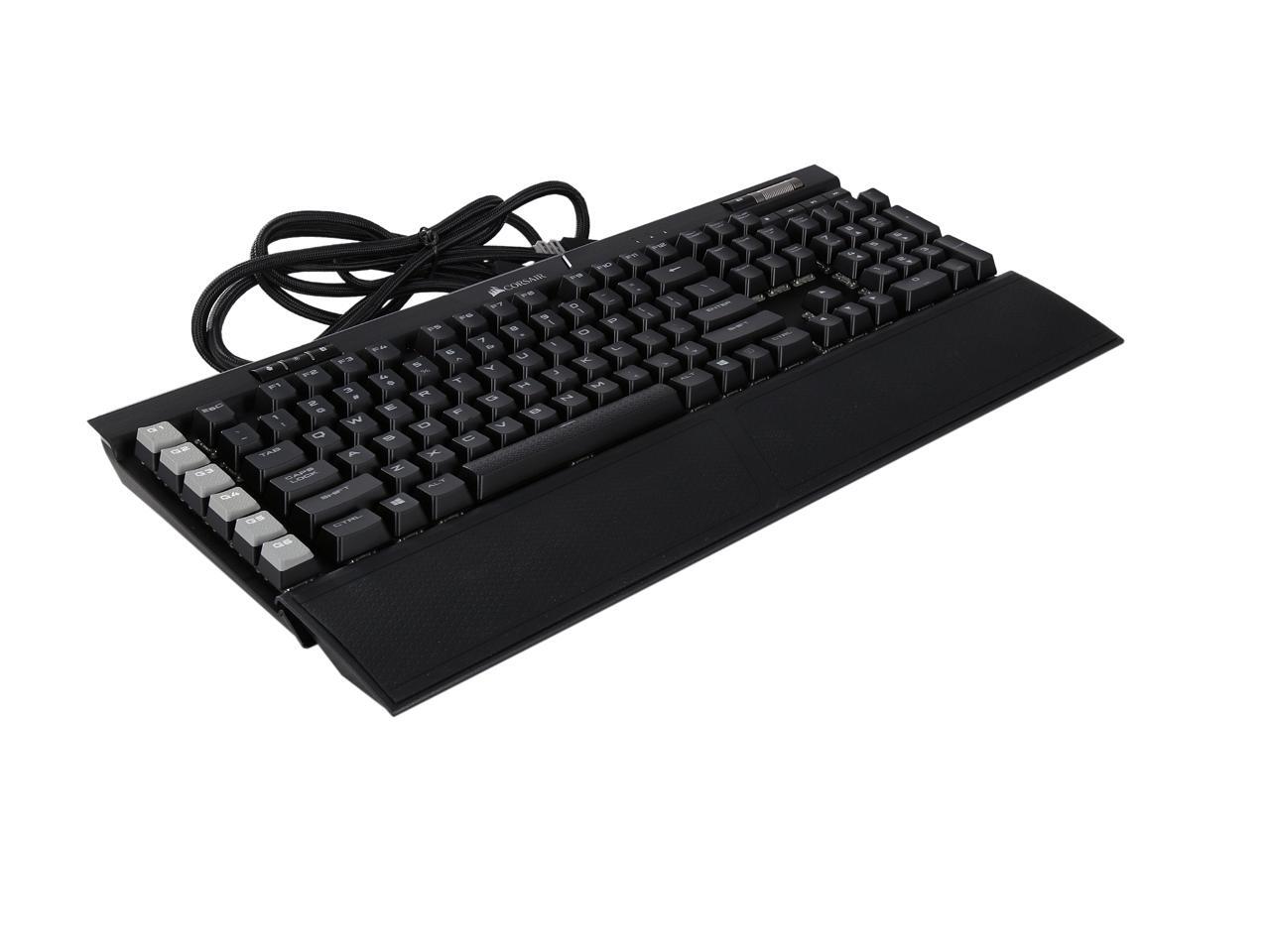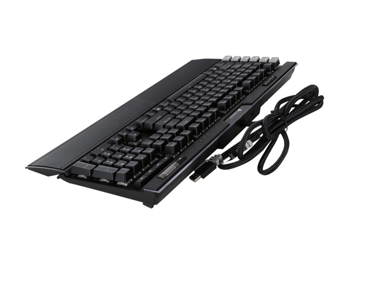 | Features | Aircraft-grade anodized brushed aluminum frame: Built to withstand a lifetime of gaming. Lightweight and rugged durability, necessary for a keyboard that’s going to see a lot of action. 8MB profile storage with hardware macro and lighting playback: Allow access up to three stored profiles on the go, independent of external software. Dynamic multicolor per key backlighting with LightEdge: Adjust each key's color and illumination level in addition to 19-zones on the top edge light bar for sophisticated and dramatic animations and effects. 100% CHERRY MX Speed RGB mechanical key switches: Unleash blistering speed with the 1.2 mm actuation and durability of gold contact CHERRY MX mechanical key switches. 6 programmable G-keys keys for in-game macros: Assign single keystrokes or complex multi-key combos to any of the 6 dedicated macro keys. USB Pass-Through Port: Provides convenient access to an additional USB port for your mouse or headset. Detachable, dual-sided soft-touch wrist rest: The comfort to enhance your gameplay during marathon gaming sessions. Choose between two different surfaces for optimal comfort. Dedicated volume and multimedia controls: Control to adjust audio on-the-fly, without interrupting your game. 100% anti-ghosting with full key rollover: No matter how fast your in-game actions are, every keypress registers correctly. Fully programmable with CUE: Intuitive and powerful Corsair Utility Engine (CUE) enables sophisticated macro programming and fast, fluid dynamic multicolor illumination. Windows Key lock mode: Stay focused and prevent accidental Windows and Context Menu key presses. FPS and MOBA keycap sets: Textured and contoured keycaps provide maximum grip and enhanced feel. |