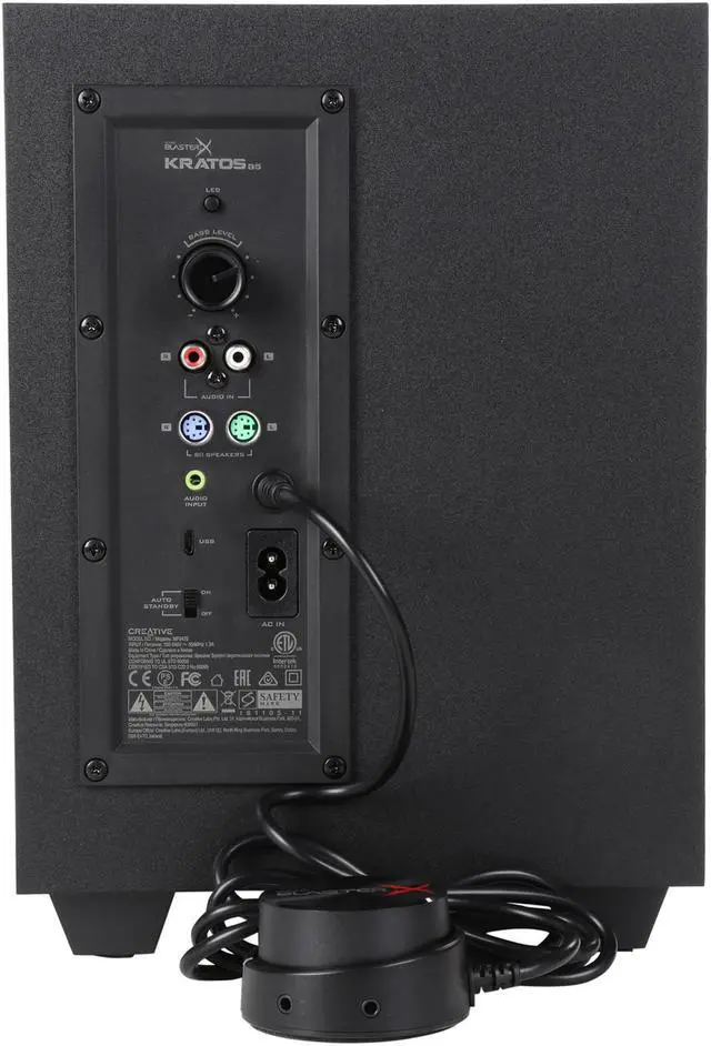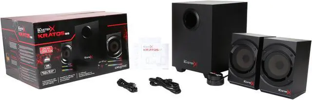 2 x Sound BlasterX Kratos S5 satellites 1 x Sound BlasterX Kratos S5 subwoofer 1 x Micro USB Cable (1.8M) 1 x power cord 1 x Warranty and Technical Support Booklet 1 x Quick Start Guide 1 x Safety and regulatory leaflet