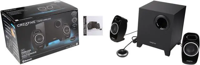 The Creative T3250 Wireless features Bluetooth® capabilities to stream music wirelessly from most stereo Bluetooth devices. Built to deliver impressive sound performance, it features Creative IFP for a wider acoustic sweet spot with improved sonic directivity, Creative DSE for louder playback with more mid-bass, and a custom-tuned down-firing subwoofer for punchy bass reproduction. It also comes with an audio control pod for ease of usage.