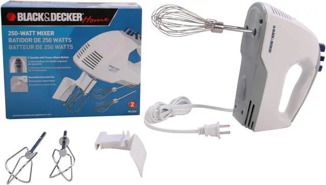 Mixing, whipping or beating different food ingredients is a snap with Black & Decker MX300 PowerPro mixer. It comes equipped with a powerful 250w motor to power through demanding tasks, while 5-level speed adjustment offers flexibility and versatility for diverse applications, from silk batter to heavy, thick dough. A beater eject button and power boost button are conveniently located on Comfort-Grip handle for easy operation. The heel rest and bowl rest enable mess-free placement. Whisks and spatula are included.