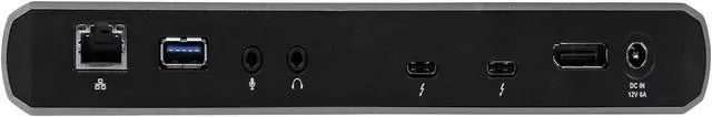 Includes three USB 3.0 ports (USB-C, 2x USB-A), two Thunderbolt 3 USB-C ports, 3.5 mm audio out, 3.5 mm microphone in, and Gigabit Ethernet