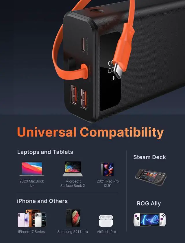 Universal Compatibility: Compatible with a wide range of USB C PD devices, Compatible with iPhone 17/17 Pro/17 Pro Max/Air, iPhone 16/16 Pro/16 Pro Max/16 Plus, Steam Deck, Steam Deck OLED, ROG Ally, ROG Ally X, Switch 2, Switch, iPhone, Galaxy, Huawei, and more, it is the ultimate charging solution for all your mobile needs