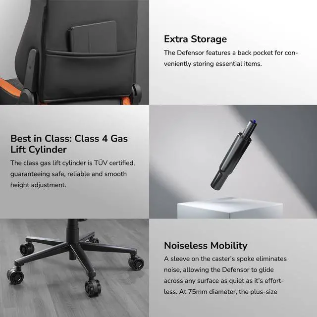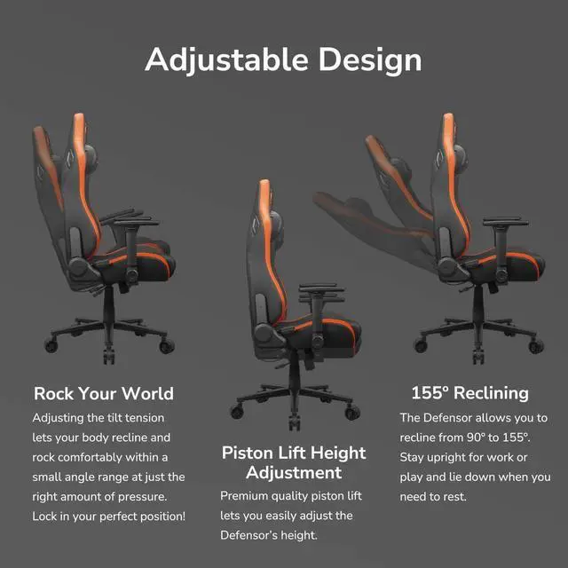 The Defensor gaming chair is designed to protect the health of your back, enabling you to game harder and longer. Its integrated PushBack advanced lumbar support system allows you to control the amount of pressure applied to your lower back, maintaining the natural curve of your spine. Featuring 4D folding armrests, high-density molding foam, and a magnetic memory foam neck pillow, the Defensor prioritizes both comfort and support.