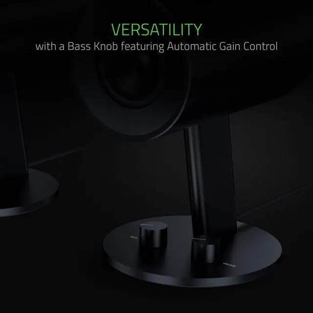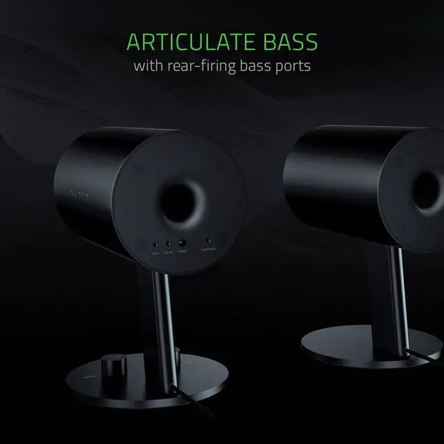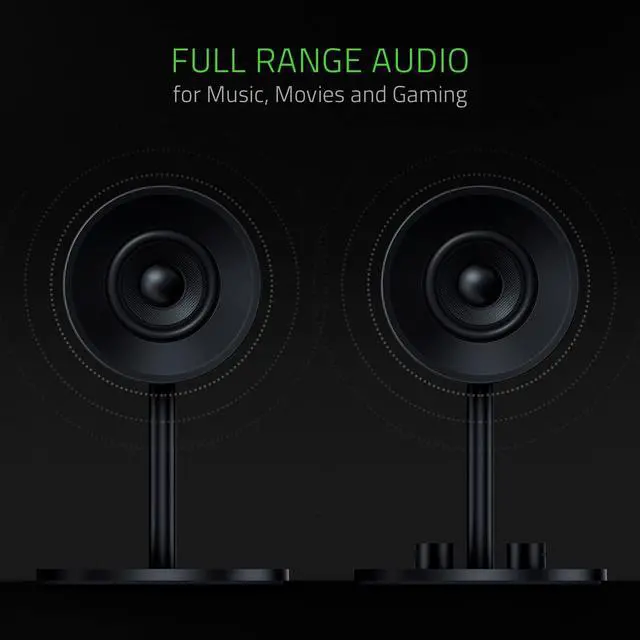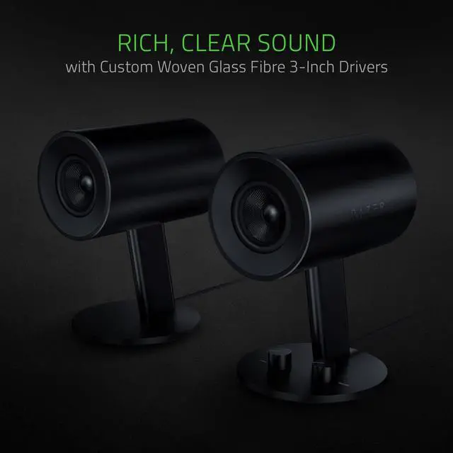 FULL RANGE IMMERSION Powerful audio can completely immerse you in your experience, bringing games, movies and music to life. With optimized drivers built for full range sound and extreme clarity, the Razer Nommo takes you to a new dimension that blurs the line between fiction and reality. CUSTOM WOVEN GLASS FIBER 3-INCH DRIVERS Our custom woven glass fiber 3-inch drivers are engineered to deliver ultra-clear sound with uncanny sharpness. By incorporating custom glass fiber into the speaker cones, it affects the vibrations and produces a tighter sound with higher frequencies, allowing you to hear distinct layers and audio details. REAR-FACING BASS PORTS Hidden behind the speaker bodies are rear-facing bass ports, each engineered to deliver increased bass output for a fuller, richer range of audio. The bass ports sit inside massive...Minimum Frequency Response: 50 HzMaximum Frequency Response: 20 kHzFeatures: Bass ReflexFeatures: Auto Gain Control (AGC)Speaker Configuration: 2.0Power Source: Power AdapterColor: BlackHeight: 8.7Width: 6.7"Depth: 5.5"Weight (Approximate): 6.50 lbPackage Contents: Nommo RZ05-02450100-R3U1 Speaker System 3.5mm Audio Cable Power Adapter with Interchangeable Plugs Important Product Information Guide Compatibility: PCLimited Warranty: 1 YearPackage Contents Nommo RZ05-02450100-R3U1 Speaker System 3.5mm Audio Cable Power Adapter with Interchangeable Plugs Important Product Information Guide "