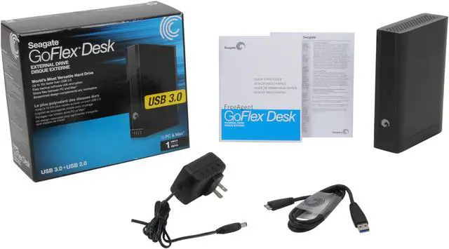 GoFlex Desk Drive Pre–loaded backup software with encryption GoFlex Desk USB 2.0 or 3.0 adapter base with capacity gauge* 5-foot (150 cm) USB 2.0 or 3.0 cable* Quick Start Guide *Not included in drive–only version
