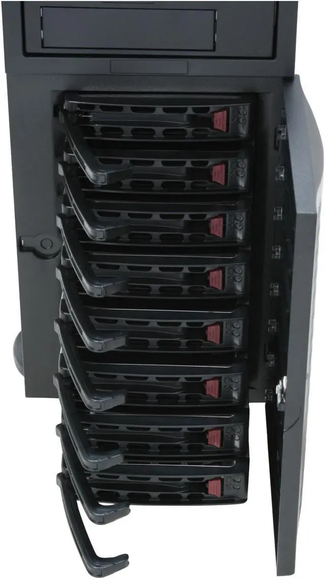1. 865W Super Quiet - High Efficiency Power Supply . 2. 8 x 3.5 SAS / SATA Hot-swappable Drive Bays . 3. 2x 5.25 Peripheral Drive Bays . 4. 1x 5.25 Drive Bay For 3.5 1.44MB Floppy Drive . 5. 7x Full-height, Full-length expansion slot . 6. 2x Front USB Ports. 7. Locking Bezel with Filter . 8. Power Switch, Reset Switch and 6x LED Indicators, 4x 6-pin Power Connectors . 9. 90-degree rotatable module. Package Contents: SuperChassis SC743TQ-865B-SQ Rackmount Enclosure 1 x SAS Hard Drive Backplane 1 x SATA Cable (2 Ft, Amphenol) 1 x Front Panel Ribbon Cable 1 x 6 Split Converter Cable 1 x 8-pin to 8-pin Ribbon Cable for SGPIO 4 x 210mm 4-pin To 4-pin Fan Power Cable 2 x (80 x 25), SC743 Super Quite chassis fan, 4-pin PWM fan assembly 1 x (92 x 25), SC743 Super Quite rear fan, 4-pin PWM fan assembly 8 x Black Hot-swappable drive tray 1 x 865W Super Quiet High Efficiency Power Supply Product Type: Server Case Motherboard Supported: EATX Product Type: Server Case Manufacturer Part Number: CSE-743TQ-865B-SQ Motherboard Supported: EATX Weight (Approximate): 56 lb Color: Black Form Factor: Rack-mountable Color: Black Form Factor: Rack-mountable Manufacturer: Supermicro Computer, Inc Product Model: SC743TQ-865B-SQ Product Name: SC743TQ-865B-SQ Chassis Product Line: SuperChassis Brand Name: Supermicro Brand Name: Supermicro Height: 7 Width: 17.2 Depth: 25.5 Number of External 3.5 Bays: 8 Number of External 5.25 Bays: 3 Compatible Rack Unit: 4U Number of Power Supplies Supported: 1 Number of Power Supplies Installed: 1 Front USB: Yes Power Supply Wattage: 865 W Number of Total Expansion Bays: 11 Product Family: SuperChassis Number of Fans Installed: 3 Number of External 3.5 Bays: 8 Number of External 5.25 Bays: 3 Compatible Rack Unit: 4U Number of Power Supplies Supported: 1 Number of Power Supplies Installed: 1 Power Supply Wattage: 865 W Number of Total Expansion Bays: 11 Number of Total Expansion Slots: 7 Total Number of USB Ports: 2