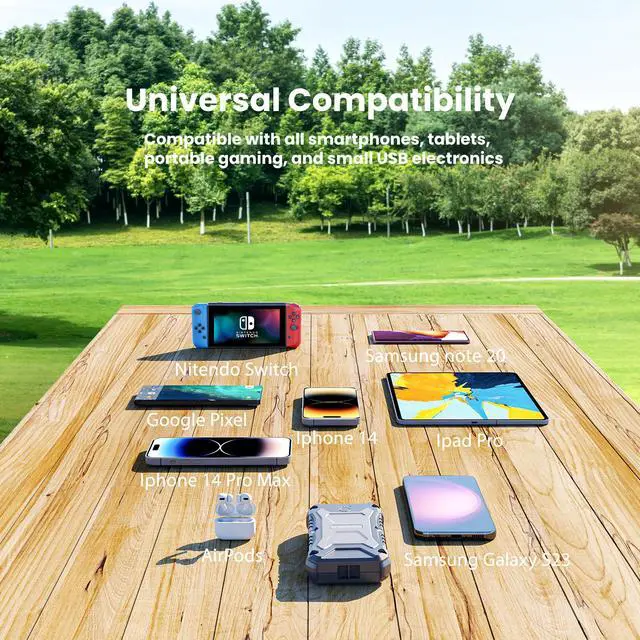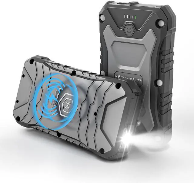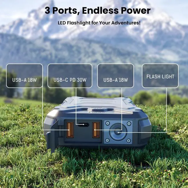The TSBar Rugged 20000 30W is a heavy-duty battery bank designed for outdoor enthusiasts, boasting a rugged, waterproof build to withstand tough environments. It's ideal for camping, hiking, and outdoor activities. With 4 output options, including an 30W USB-C PD port, two 18W USB-A ports, and a 15W wireless charging pad, it offers versatile charging for various devices. This power bank delivers fast charging, up to 4 times faster than standard chargers. It features a powerful flashlight with multiple modes for emergencies, offering up to 120 hours of use. With a 20000mAh capacity, it can charge phones multiple times and is compatible with a wide range of devices, making it an essential companion for adventurers. USB/USB-C Ports: Phones: Universally compatible with all smartphones such as iPhone 16, 15,14, 13, 12, 11, XS, X, XR, SE, 8, 7, 6, iPad Air/Pro, Samsung S25, S24, S23, S22, S21, S20, S10, S9, S8, S7, S6, Note 20, 10, 9, 8, Tab, Androids, LG, Motorola, Sony, Pixel, Google, HTC, Oppo, Huawei, Small USB electronics, Airpods, Bluetooth headphones, GPS, Cameras, Drones, Speakers, and other USB/USB-C Electronics. Tablets: Universally compatible with all tablets such as iPads, Galaxy Tab, Fire, Google and more Wireless Charger Pad: Compatible with all wireless charging phones such as iPhone 8, X, XS, XR, SE 2020 & 2022, 11, 12, 13, 14, Samsung Galaxy S9, S10, S20, S21, S22, S23, Note 10, 20, Pixel, and more. This list is not exhaustive. If your phone is not listed and you plan on using the wireless charging pad please confirm whether your phone can be wirelessly charged. Output Ports: USB Type-C Port: 5V/3A, 9V/3A, 12V/2.5A, 15V/2A, 20V/1.5A (30W) USB-A 1/2 Ports: 5V/3A, 9V/2A, 12V/1.5A (18W) Wireless Charging Pad: 15W Input Port: USB Type-C Port: 5V/3A, 9V/3A, 12V/2.5A, 15V/2A, 20V/1.5A (30W)