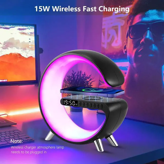 - 15W Wireless Charging Sleep Lamp Sunrise Wake Up Lamp Atmosphere Lamp Bedside Lamp Dazzling Light Effect Bluetooth Audio Clock Alarm Clock.