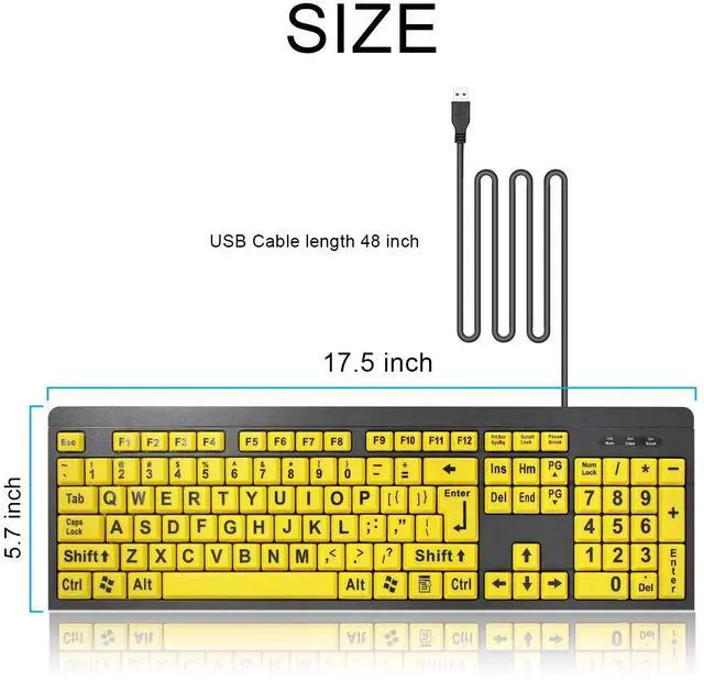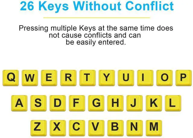 Traditional full size 104 key wired keyboard QWERTY US layout for simplicity and comfort.(26Keys No Clashing). The large keys are slightly spaced, featuring big-print letters to lowers the chance of hitting the wrong key.