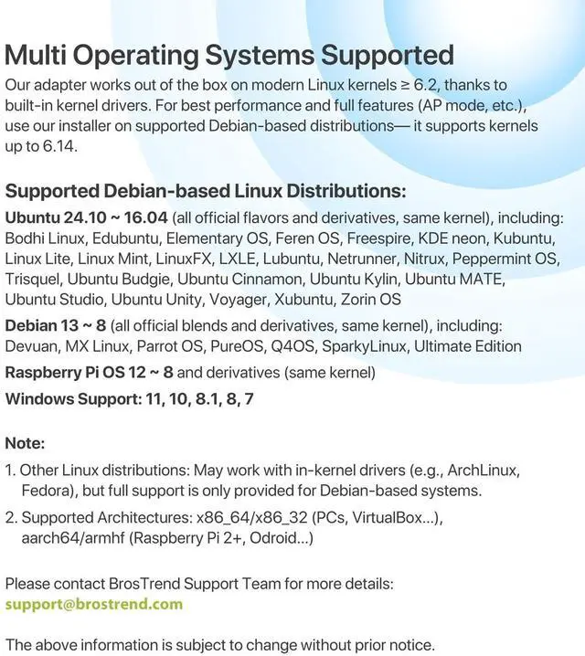 Compatible with all distributions that have Linux kernel 6.2 or newer (after February 2023) Ubuntu 24.10~16.04 (all flavors: Kubuntu, Lubuntu, Xubuntu, Edubuntu, GNOME, Budgie, Cinnamon, Kylin, MATE, Studio, Unity), Raspberry Pi OS 12~8, Debian 13~8, Linux Mint 22~18, Kali, Bodhi Linux, elementary OS, Feren OS, Freespire, KDE neon, Linux Lite, LinuxFX, LXLE, Netrunner, Nitrux, Peppermint OS, Trisquel, Voyager, Zorin OS; Windows 11/10/8.1/8/7