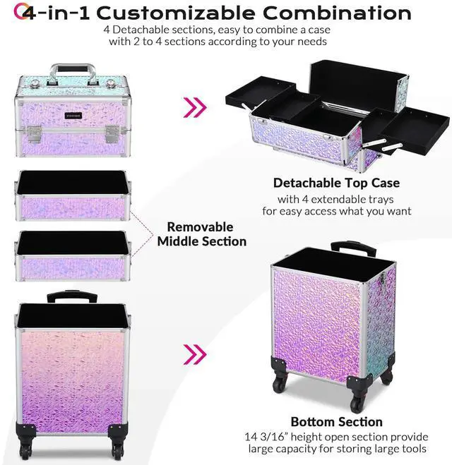 - 4-in-1 Customizable Structure - 4 Sections allow free combination, can be combined into 1 large train case or used as a 2 to 4-layered trolley; The 2nd and 3rd section for providing 2-layer space to store lipsticks, mascaras, palettes, etc., and the 4th section is a large space for large tools, hair dryers or irons
