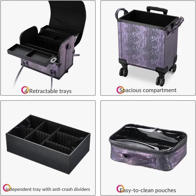 - Large Capacity - Top case with 4 retractable trays & spacious compartment to make your cosmetic organized and easy to get; Large bottom section contains 1 independent tray with dividers & 2 big clear pouches for sorting cosmetics