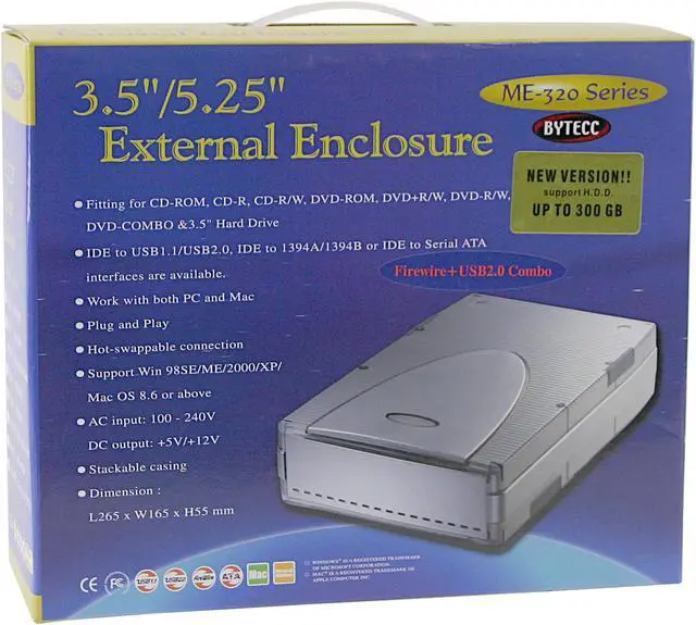 | Features | Work with most CD-ROM, CD-RW, DVD-ROM, DVD+/-RW AND 3.5" HDD Work with PC and Mac Support up to 300GB HDD Plug and Play Hot-swappable connection AC input: 100 - 240V DC output: +5V/+12V Stackable casing OS: Windows XP/2000/ME Windows 98SE (need driver) Mac OS 8.6 or above |
