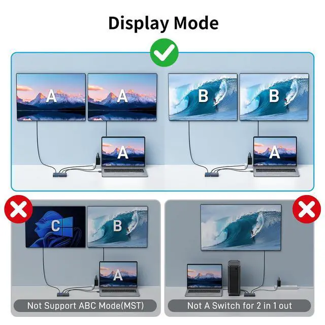 This HDMI Splitter supports AAA mirror mode, and ABB extend mode. Cannot support ABC(MST) extend mode.