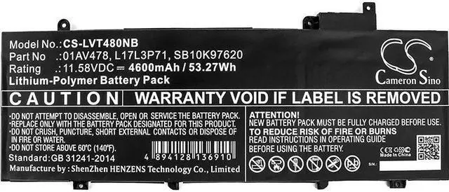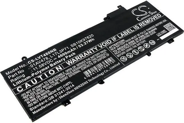 Battery for Lenovo ThinkPad T480s ThinkPad T480s 20L7002LCD ThinkPad T480s Compatible with the following devices ThinkPad T480s, ThinkPad T480s 20L7002LCD, ThinkPad T480s 20L7002XCD, ThinkPad T480s 20L7A006CD, ThinkPad T480s 20L7A00TCD, ThinkPad T480s 20L7A00UCD, ThinkPad T480s 20L7A011CD, ThinkPad T480s-20L8S02D00 Compatible with Battery Part Numbers 01AV478, 01AV479, L17L3P71, L17M3P71, SB10K97620, SB10K97621