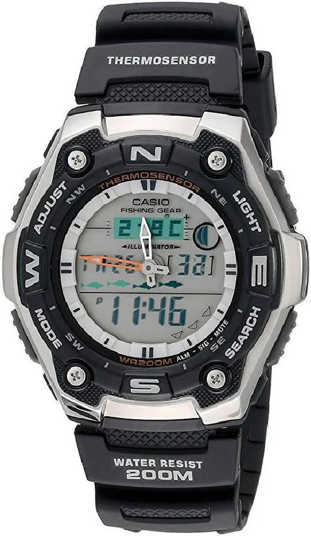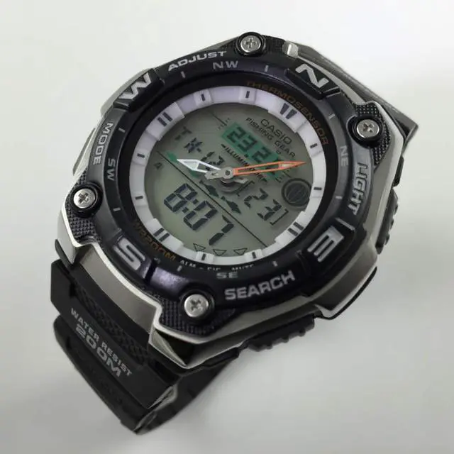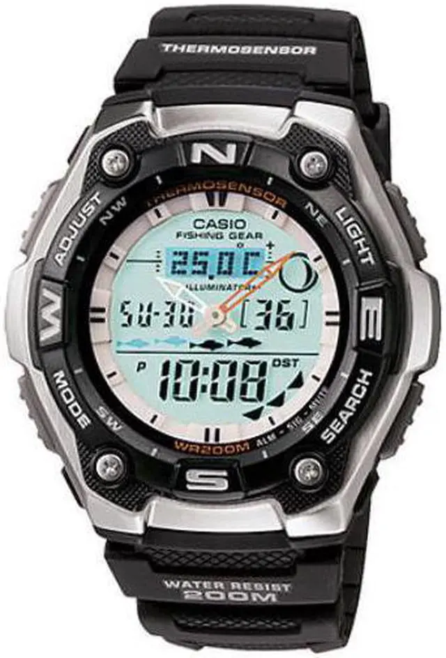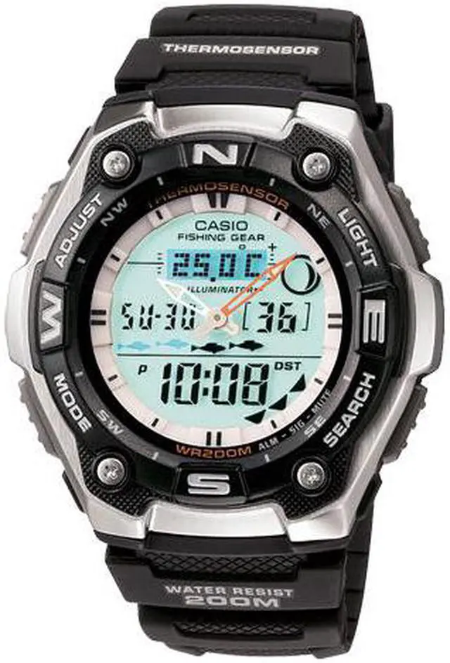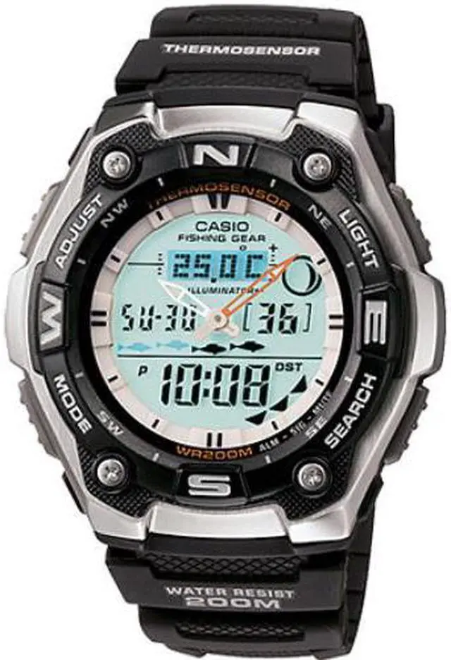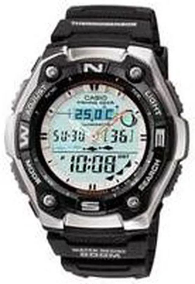 Memory capacity: Up to 50 temperature records Fishing mode The suitability of a specific date and time for fishing as indicated as one of five levels Moon Data (moon age of input data, moon phase graph) World Time 30 time zones (50 cities), city code display, daylight saving on/off 1/100-second stopwatch