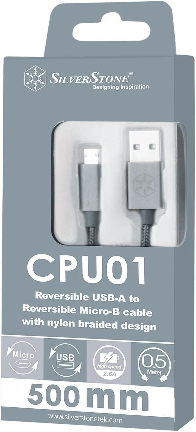 | Features | Reversible USB-A and Micro-B connectors Cable sleeved with nylon braiding Connectors constructed with aluminum housing Supports high speed charge and data sync CPU01 is a SilverStone designed cable for mobile phones, tablets, and other digital devices requiring USB connections. It has premium construction with nylon braiding and textured aluminum connector housing for great feel while in use. It also has reversible USB-A to reversible Micro-B connectors with durable design and high power current loading capability, making it extremely easy to use and immensely useful. |