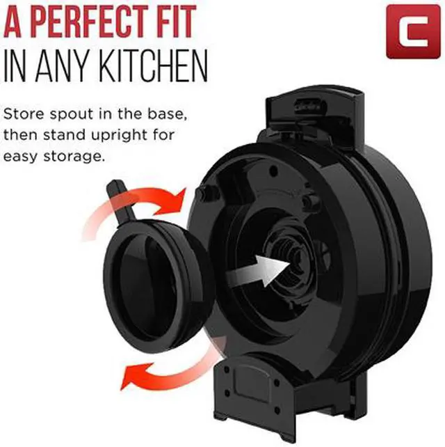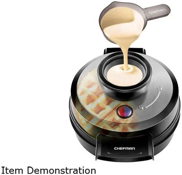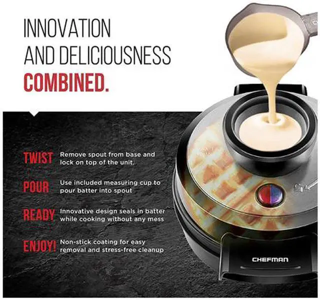 | Features | UNIQUE: award winning, innovative, patented design with anti-leaking system seals in batter while cooking for mess-free & stress-free waffles 1-2-3 OPERATION: simply twist pour-spout into base and, pour batter using included measuring cup (watch batter bubble up like lava!), and enjoy! FAST, EASY & CONVENIENT: extra-strong non-stick coating for easy cleaning; FREE measuring cup and spout for perfect waffles every time, spout fits in the base, can be stored in vertical position. EXPERIENCE CLUB CHEFMAN: includes access to Club Chefman for recipes, videos, help from a chef, cookbooks and more! |