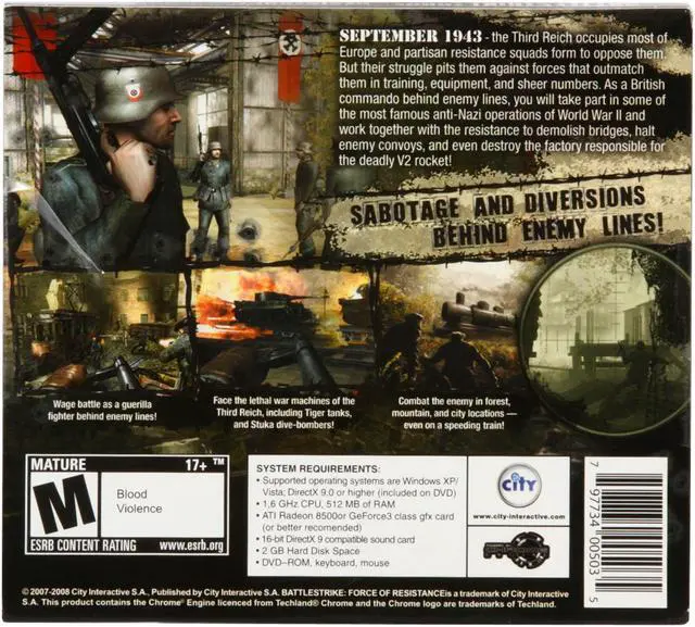 | Features | It is September, 1943. The armies of the 3rd Reich occupy virtually the entire territory of Europe. The lands taken by the Germans spread from Brest, a town on the western brink of the continent, to the suburbs of Stalingrad. Numerous resistance groups operate in the occupied regions of Europe. Using the tactics of surprise attacks and the support from local people, they can effectively confront much larger, better-equipped and trained troops of the enemy. The British government dispatches one of its best commandoes to the Central Europe. Poland, Lithuania, Ukraine and Belarus are the countries where the resistance movements are most active. The Englishman's tasks involve training and support for local guerrilla fighters in the most daring sabotage and diversion actions. Among others, you will embark on typical missions like blowing up bridges, assaults on enemy convoys to stack up necessary ammo and weapons. The player will also participate in a bank robbery, and last but not least—destroy a legendary facility producing V2 rockets! |