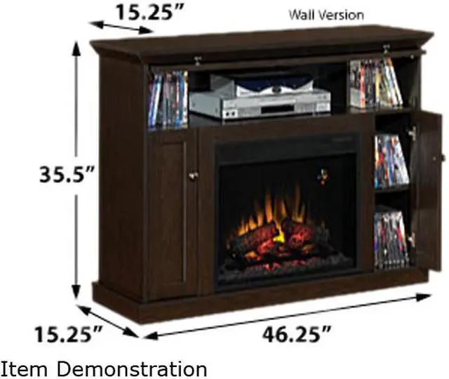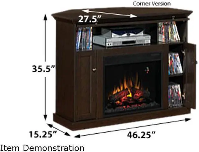 • neweggDual mantelThe ClassicFlame 23DE9047-PE91 is constructed from engineered wood and comes in Oak Espresso finish. This model is a dual mantel, which means it comes with an additional corner piece, allowing it to be configured as a wall or corner mantel. The corner piece is weight bearing, making it strong enough to support a TV up to 150 lbs. Two side cabinets with adjustable shelves allow you to store electronic media components and your CDs or DVDs.
