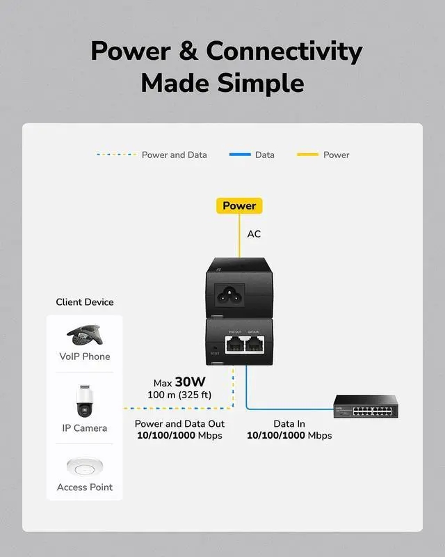 Connect the power, switches/routers, and clients—the adapter will automatically detect the required power wattage and deliver it accordingly.
