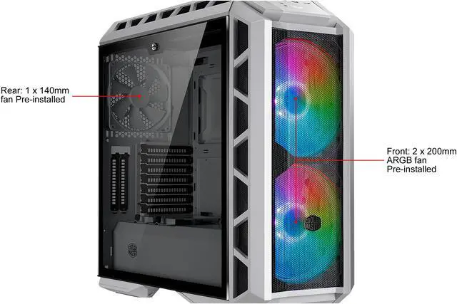 | Fan Options | Front: 3 x 120mm / 3 x 140mm fan or 2 x 200mm fan (2 x 200mm ARGB fan Pre-installed) Top: 3 x 120mm / 3 x 140mm fan or 2 x 200mm fan Rear: 1 x 120mm / 1 x 140mm fan (1 x 140mm fan Pre-installed) |