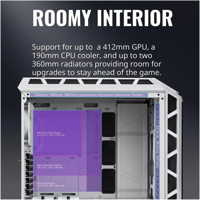 Cable covers1, a CPU cutout cover2, and PSU shroud3 take cable management to the next level. Assemble clean builds like a pro!