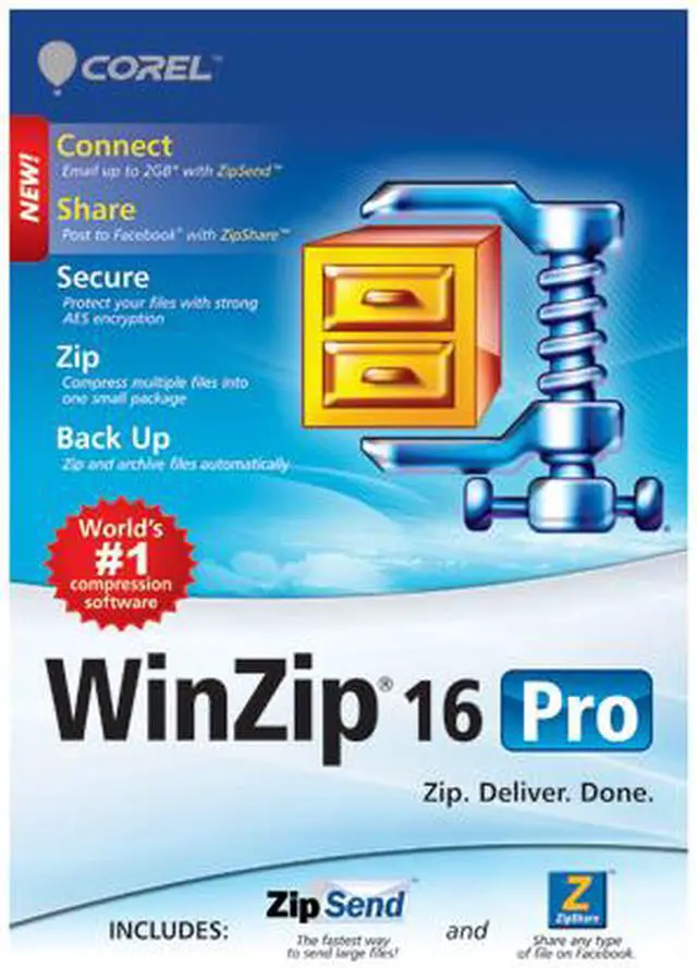 WinZip® Pro takes file compression to the next level with an automated data backup facility that helps you prevent data loss. Back up your desktop, documents, pictures and email so that you never lose a thing! Working with sensitive material? WinZip Pro's AES encryption tool will password-protect your files as you zip them. WinZip Pro also offers several innovative file sharing solutions to help you send large files without clogging email systems. You can even post zipped files directly to Facebook!