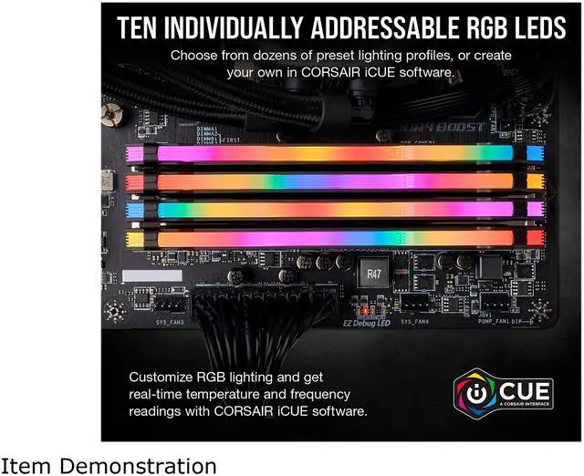 | Features | Dynamic Multi-Zone RGB Lighting 10 Ultra-bright RGB LEDs per module. Next Generation Software Take control in CORSAIR iCUE software and synchronize lighting with other CORSAIR RGB products, including CPU coolers, keyboards and fans. Custom Performance PCB Provides the highest signal quality for the greatest level of performance and stability. Tightly Screened Memory Carefully screened ICs for extended overclocking potential. Maximum Bandwidth and Tight Response Times Optimized for peak performance on the latest Intel and AMD DDR4 motherboards. No Wires Required Requires no extra wires or cables for a clean and seamless install. Maximum bandwidth and tight response time Optimized on the latest AMD and Intel DDR4 motherboards. Supports XMP 2.0 A single BIOS setting is all that's required to set your memory to its ideal performance settings, for for optimum performance. |