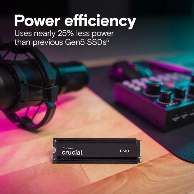 The Crucial P510 offers powerfully fast Gen5 read/write speeds of 11, 000/9, 500MB/s, reducing load times while enhancing overall system responsiveness. Built for desktops & PS5 gaming consoles with an easy-to-install single-sided design and power-efficient architecture, the P510 offers lower energy consumption and is designed to support battery life. Backed by Micron? s 45-year reputation for quality and reliability, the Crucial P510 delivers top-tier performance that can boost everything from your workflow to your next game.