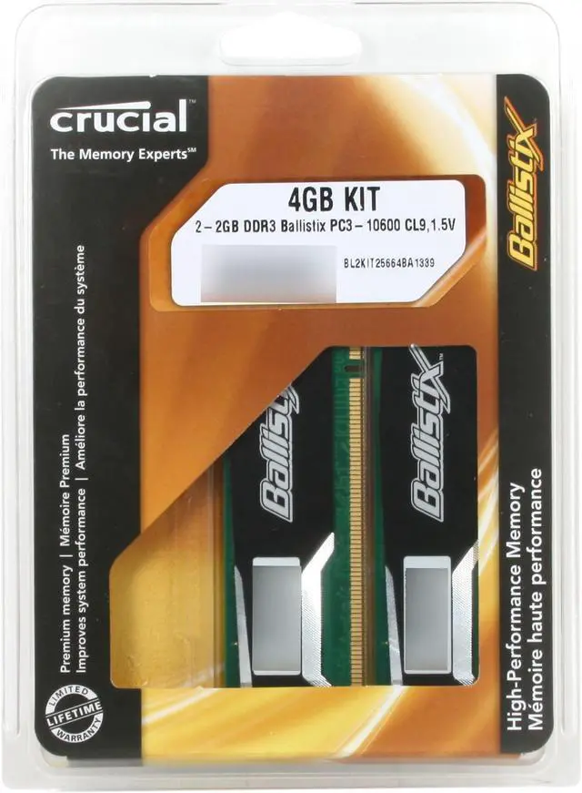 • neweggDual-Channel DDR3 PC3-10600 Memory KitEngineered to operate at 1333MHz at standard timings of 9-9-9-24 and 1.5v, this 4GB (2GBx2) Ballistix DDR3 memory kit is ideal for dual-channel DDR3 based Intel or AMD platforms and is guaranteed compatible.