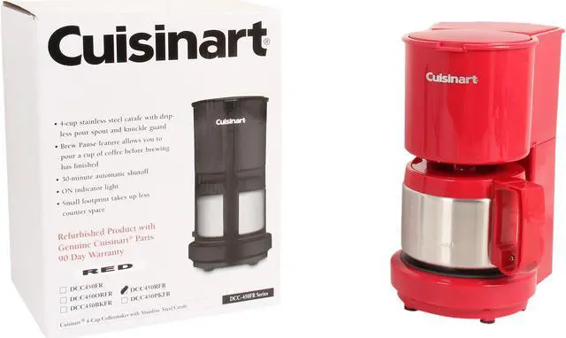 | Features | Cuisinart's 4-Cup Coffeemaker is now available with a stainless steel carafe. It's compact enough to use for a small household or second home. Automatic shut-off after 30 minutes, so there is no need to worry when you leave the house in a hurry. 4-cup stainless steel carafe with dripless pour spout and knuckle guard Brew Pause feature allows you to pour a cup of coffee before brewing has finished 30-minute automatic shutoff "On" indicator light Small footprint takes up less counter space Instruction book BPA Free |